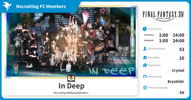We are a collection of new and experienced players with a diverse spectrum of interests!We are active in all game content--progression, crafting, housing, treasure maps, deep dungeons, whatever you are looking for! No matter your path, you'll have friends to support you along the way!