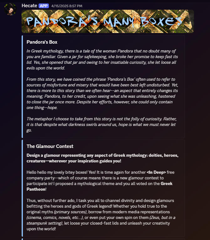 We are a collection of new and experienced players with a diverse spectrum of interests!We are active in all game content--progression, crafting, housing, treasure maps, deep dungeons, whatever you are looking for! No matter your path, you'll have friends to support you along the way!